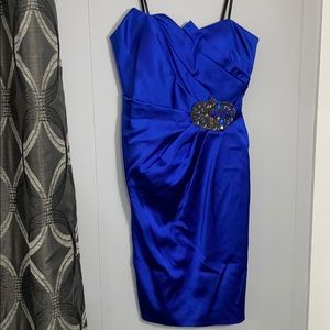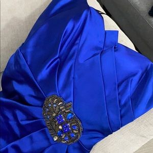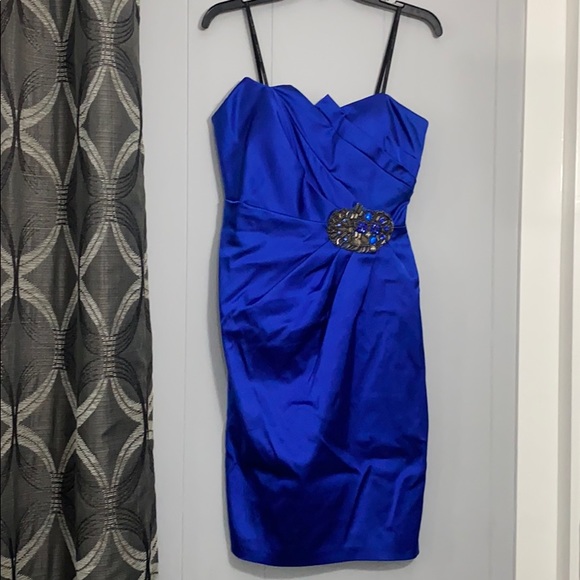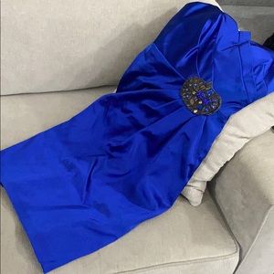 Jagged-Hem Satin dress. Beautiful sleeveless David Meister evening/cocktail dress, rustic bronze brooch looking design on the left side around the waist area, giving the unique touch. Color royal blue. New in great condition, never wore., still have the tag, it’s wrinkly because it was in it’s original box. It’s impossible to not get compliments when wearing this dress. Self: 63% Acetate, 35% Nylon, 2% spandex. Lining: 100% polyester.