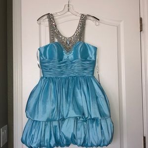 Light blue and fluffy at the bottom with rhinestones straps. NO STAINS OR RIPS Brand new NWT