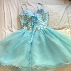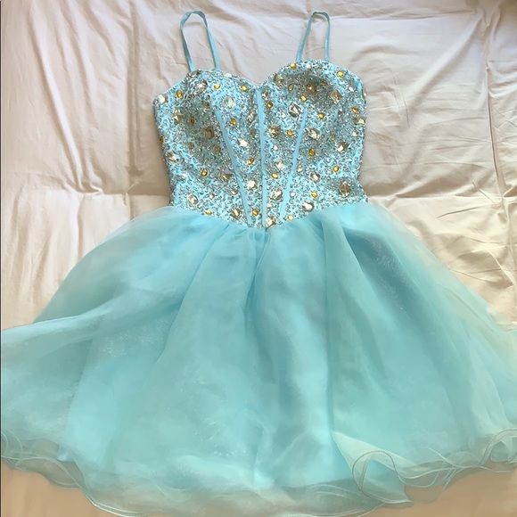 Light blue with rhinestone corset with gold and silver accents. Petty coat skirt