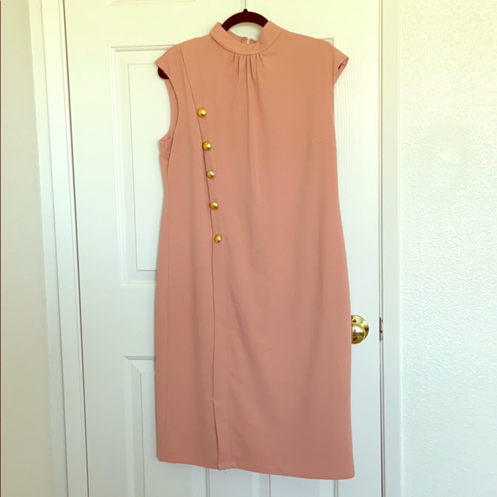 Salmon colored dress with gold buttons. Great fit with tiny slit below the knee. A thread pulled out, see photo. Other than that great condition only worn once.