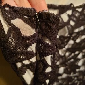 White shirt with black lace overlay. Attached. Written once! Beautiful & comfortable. Has a zipper on side that hides away. Got so many compliments the one time I wore it out. Im not a dress person, only on special occasions.