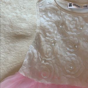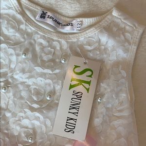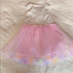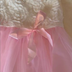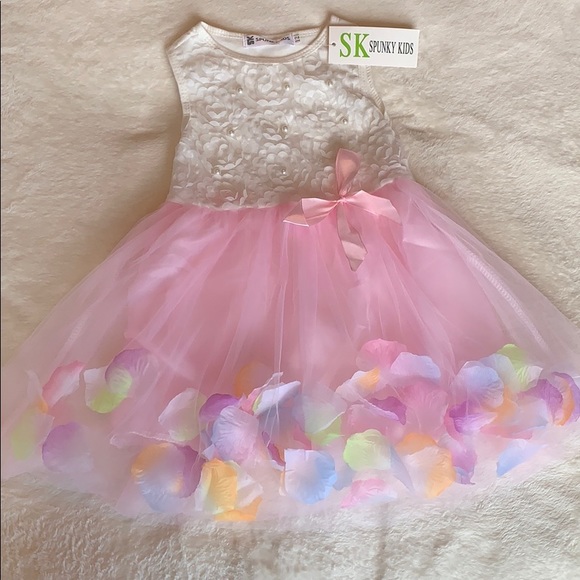 New with tags. Size is 120 which says 5 but it runs small more like 3T. . Bought online for a wedding but the colors didn’t end up being right so went with something else. It’s very pretty with flower petals floating inside and a floral & pearl design on top. It’s light pink & white. Comes from a smoke and pet free home.