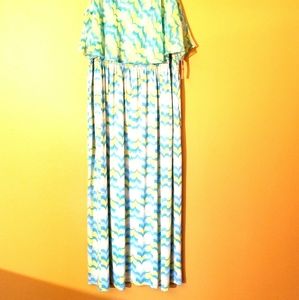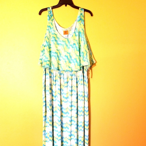 Dazzling baby blue, pastel yellow, and light green dress, very vibrant and youthful.