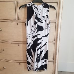 Size 0 black and white floral Cache dress. Good condition. 95% polyester, 5% spandex.