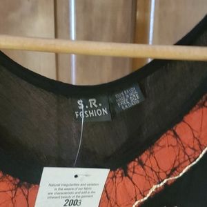 Black knee-length dress with red and beige accent embroidery, sleevless