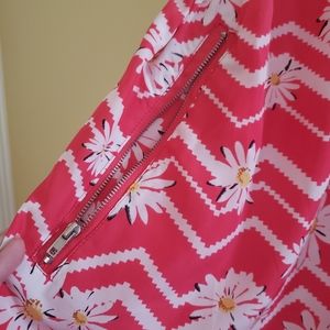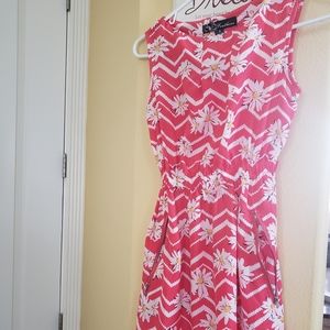 Short sleeve, mini dress, cinched at waist, with zippered pockets.