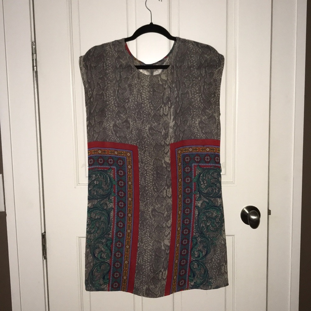 Shift dress with snakeskin print and baroque patterns. Very cute and unique. Slip underneath
