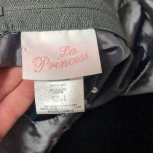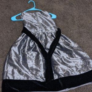 Lightly Used Special occasion dress with flower pattern and bow in the front. Velvet trim. Silver and gray colored dress.