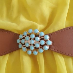 Yellow shear,Jewell belted,pleated sleeveless dress,short flowey,elastic waist.one button back closer