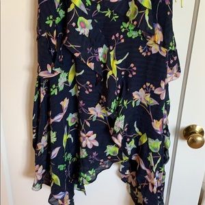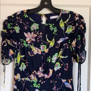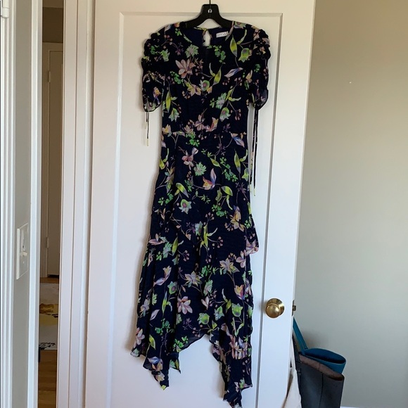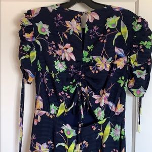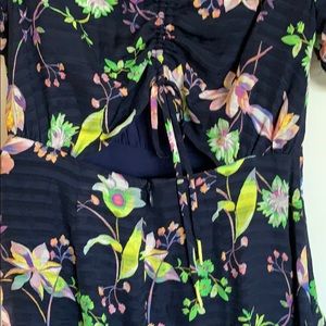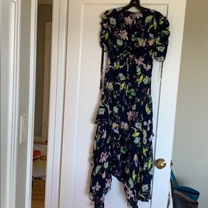 Tanya Taylor soft silk summer dress in excellent condition. Only worn once and cleaned. Triangle open back tie. Ruffle tiered. Beautiful colors of green, lavender, yellow, pink floral prints.