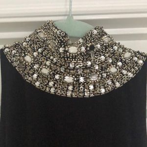 This dress is so beautiful and classy! The color is so hard to pick up with a camera, but it’s a soft gold color. The collar is beautiful and every bead is still in place! Only worn once, and never altered. The bow can be worn in the front or the back!
