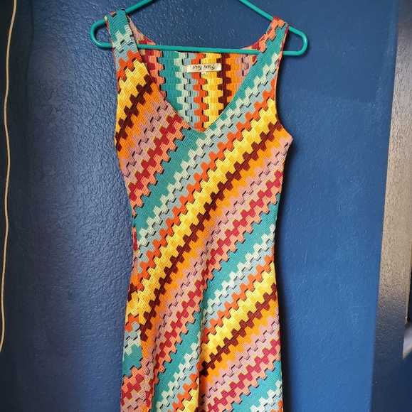 Pull on multi-colored dress. Form fitting, falls to knees. Lined.