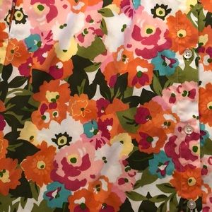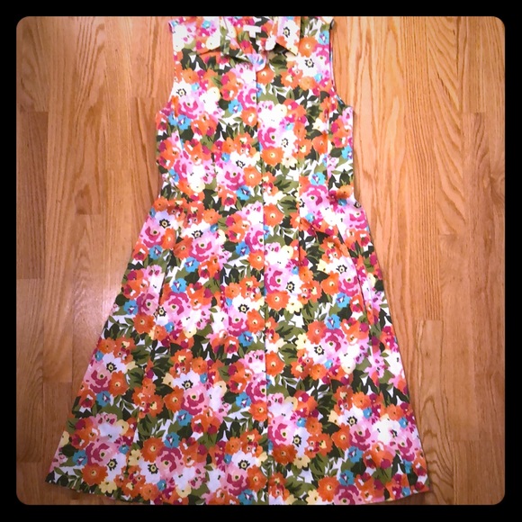Fit and flair sleeveless dress with a collar in a bright summery print. Buttons up the front. Cotton with a hint of spandex.