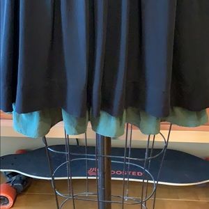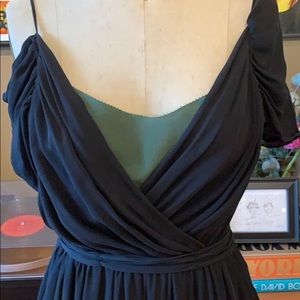 Silk black and green dress. Side zip. Sleeves can be worn down or up. Adjustable strap. Hits me mid thigh and I’m 5’10