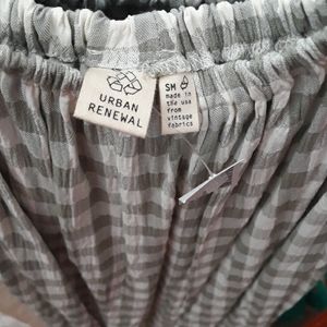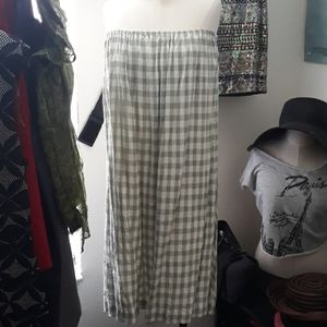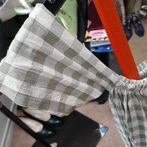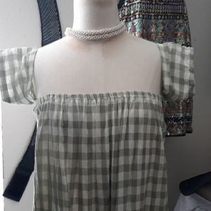 Soft mint green & cream, linen, above knee, cap sleeve or able to tuck sleeves for strapless look. Can also drop to waist & wear as a skirt, that sits at calf. Sz small-medium.