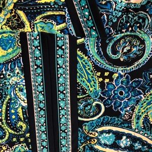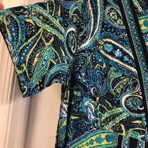 Pull over dress with deep neckline, and elastic waist. Sleeves are classic short sleeves.