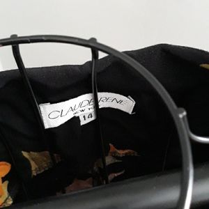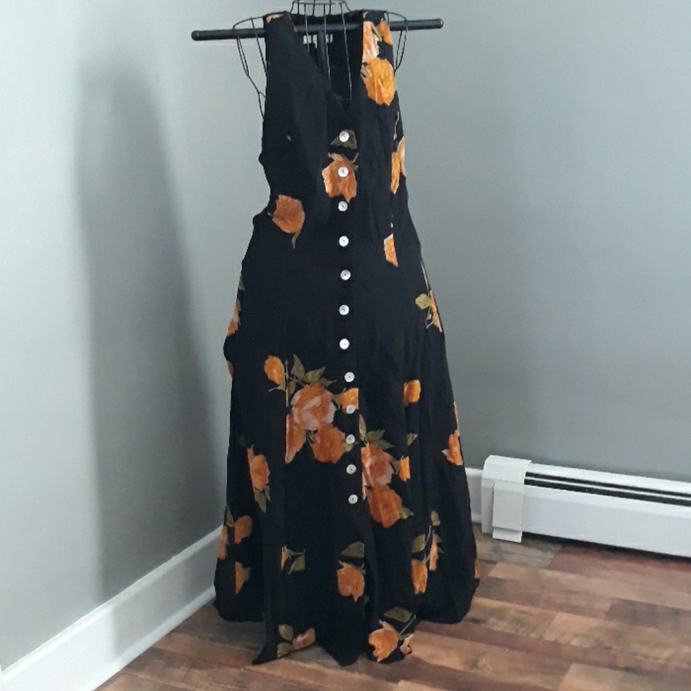 Long dress,floral print,button down front,Black with rust color flowers,sleevless, slightly worn