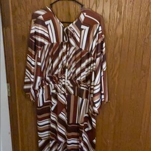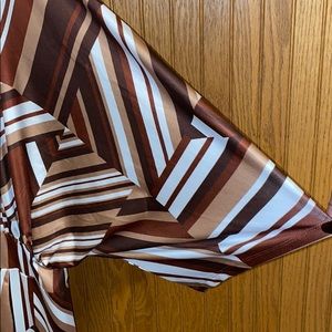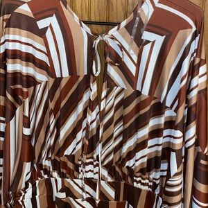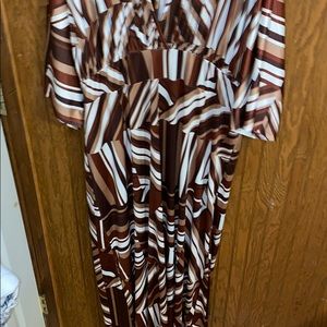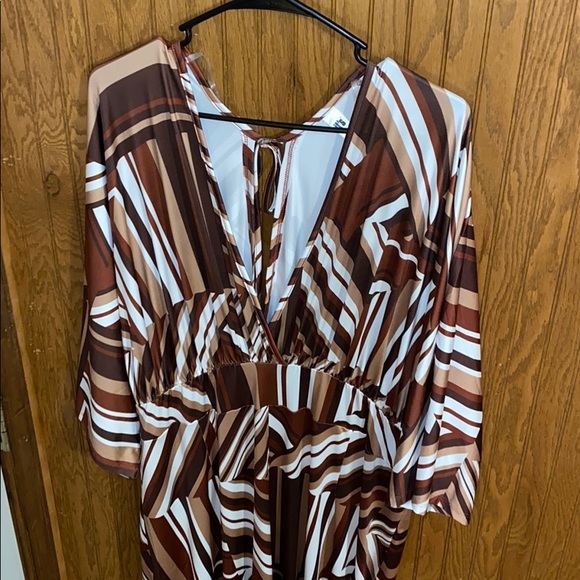 Multi color maxi dress (brown, beige, cream) With a plunging neckline and tie closure in the back which creates a tear drop opening. 90% Polyester and 10% spandex