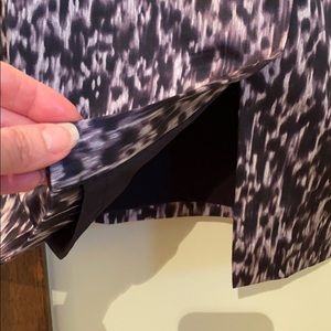 Sleeveless, v neck, slit on left front, zip back, 52% silk, 44% cotton, 4% spandex. Fully lined