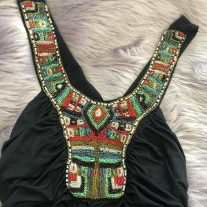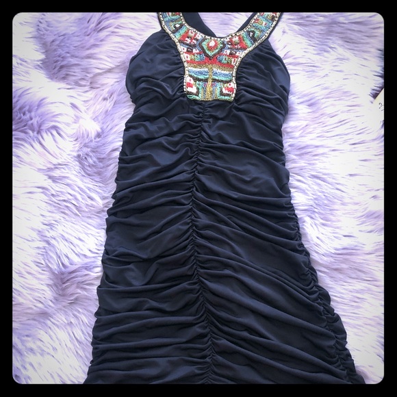 Black mini stretchy dress, beaded work at neckline, worm twice tag cut off