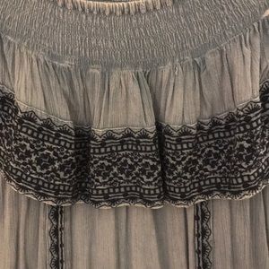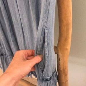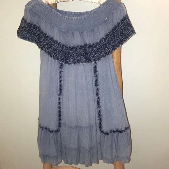 Muche and Muchette mini off the shoulder denim dress with navy detail. Only a few spots on seem that need gemmed but would be a 5 minute job. Only worn once. Luxe boutique.