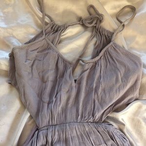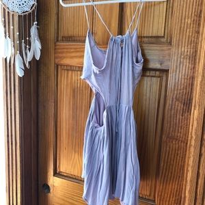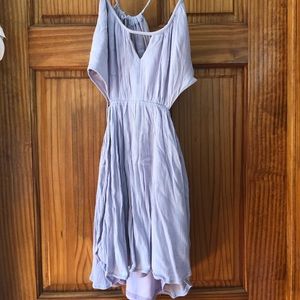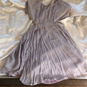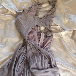 Lilac dress with cut out sides. Made me feel like a pixie! No longer fits me. Size 4. Slits on side but they fold so it doesn’t show anything & slip underneath. Ties in upper back and has zipper. Wore a handful of times but still in great shape! I don’t see any noticeable flaws. Nice fabric, beautiful color. Definitely true to color in my last 4 photos. Looks like it has a slight tinge of gray in dull lighting like the other photos.
