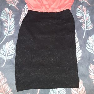 Super cute dress. You can dress this up for work with heels. Great dress for weddings. The top is an orange color with a black lace bottom.