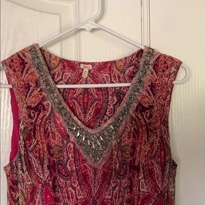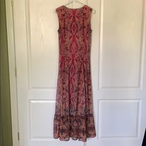 Ankle length, sleeveless, v-neck, 97%polyester 3 %spandex and lining is 100 %polyester, hand wash, hand to dry, detailed sequence neckline on a tule background, over the head