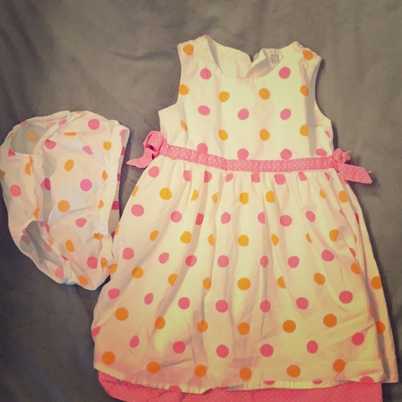 White dress with orange and pink dots. Pink bows on side.