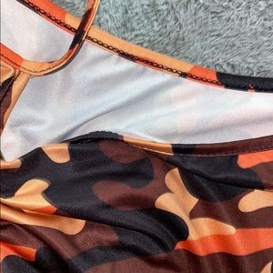 Orange camouflage knee length dress with spaghetti straps. This dress is a medium but does fit like a large so it does run a little big and fits loose.