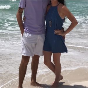 Blue dress, flowy comes down to mid thigh.