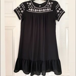 This dress is black and has a bit of white in it. It is very comfortable and good fitted. The bottom is a loose fitted dress that is good for big and small parties.