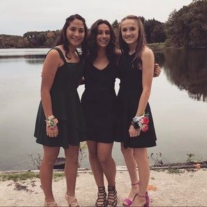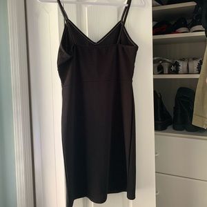 Adjustable spaghetti strap black dress with white stitching. This dress has been worn once and in great condition. It can be worn while going out or for a formal event depending on what accessories used.