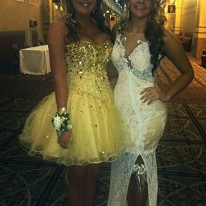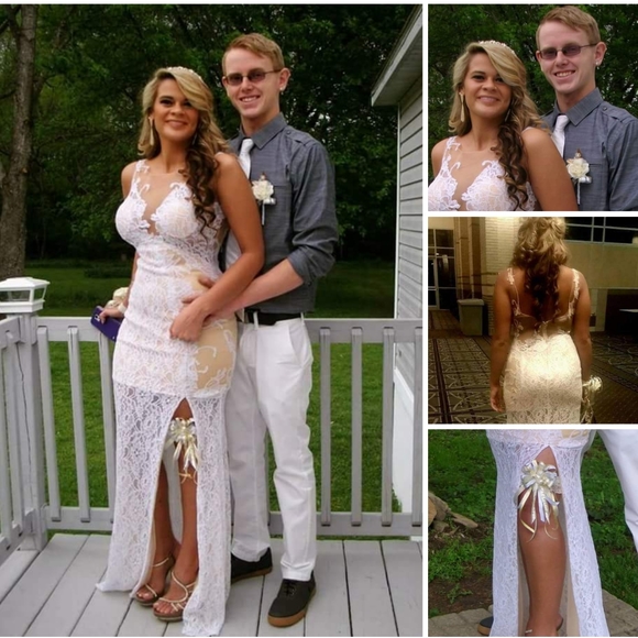 Prom dress size 10 fits like an 8 I was 140 when I wore it an I am 5'5" train is long its in GREAT condition!