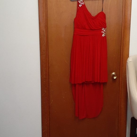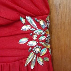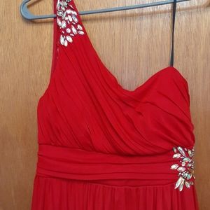 Red off one shoulder sequence party dress zips on the side