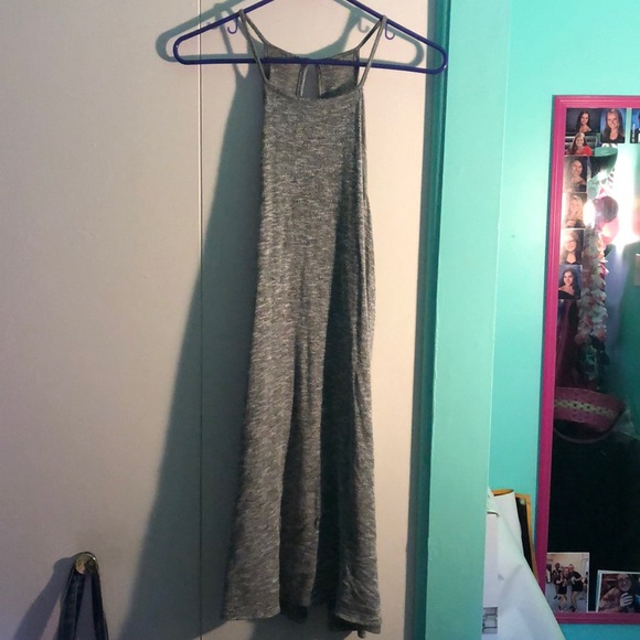 This grey white dress is sized medium. It does fit a little larger and is about knee length. A knot can be tied at the bottom to make it shorter and give it a cuter, tighter look.