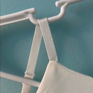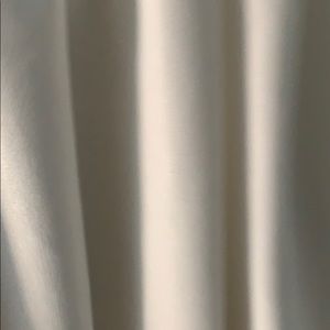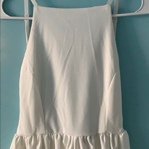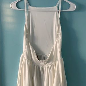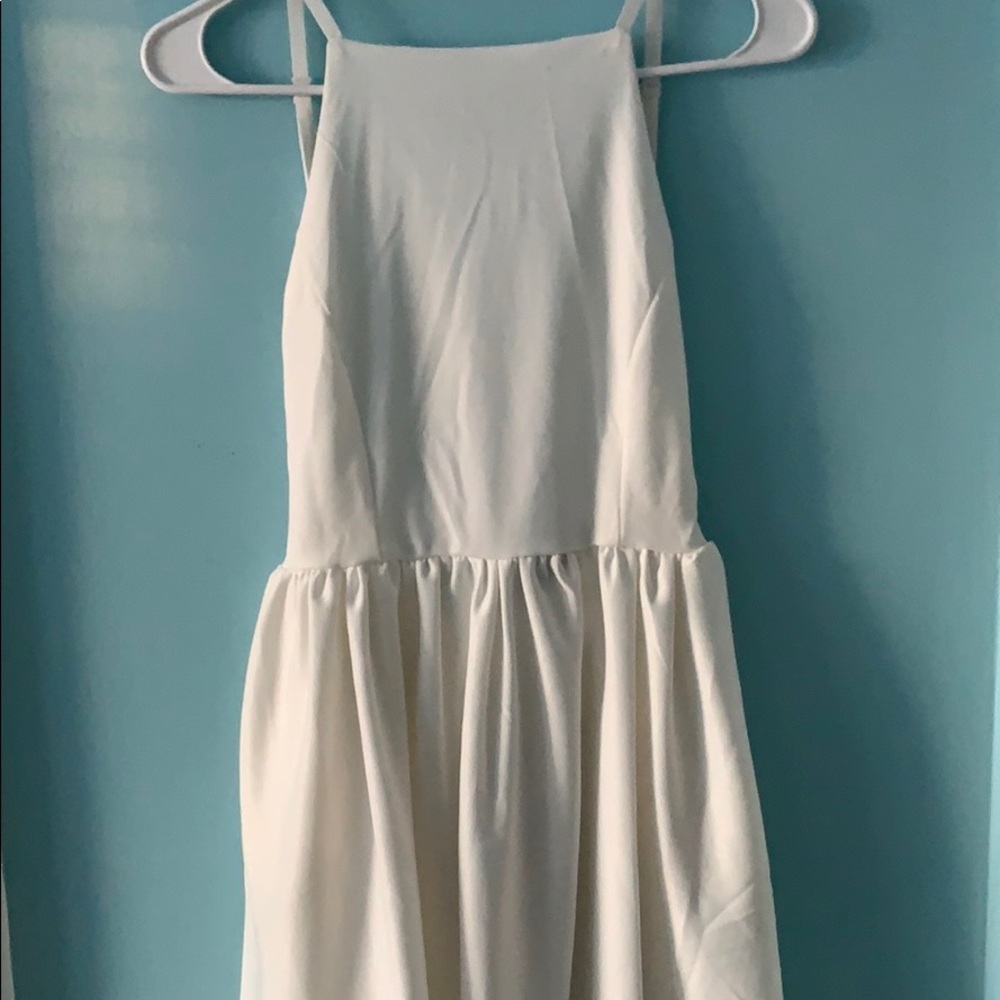 Open back creme/white dress. Tight around chest and loose/flowy toward the bottom. Fittest at waist.