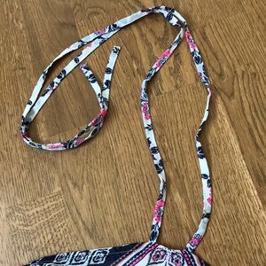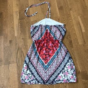 Express summer dress, small, cinched waist, I’m 5’5” and it’s about 4 inches above my knee, it’s on the shorter side for me. I’m a medium and the small is a little tight but runs big for a small.