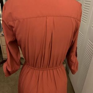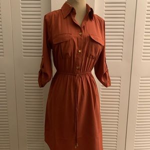 Dark orange dress with gold accents, worn once size small material polyester, sleek light beautiful dress! One of my favorites.