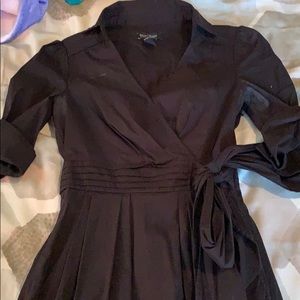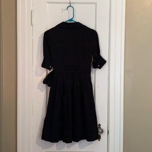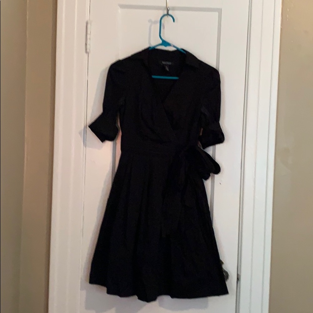 Mid thigh black dress with color. V neck. Tie around the waist and side zipper. Worn 3 times