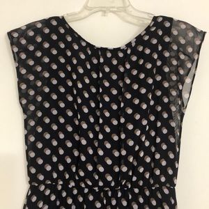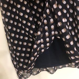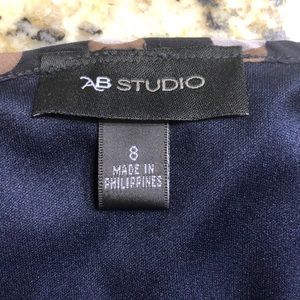 Worn one time light flowing dress 100% Polyester dress 100% Polyester lining Length is right to top of knee Dark navy is the base color