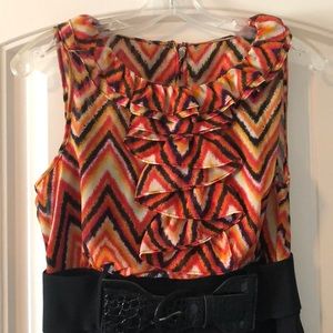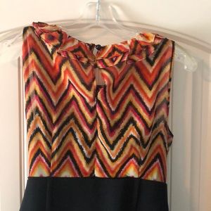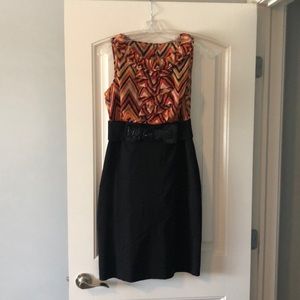 Top is sheer with attached black cami underneath. Hits right above the knee in length. Zipper and top button in the back.