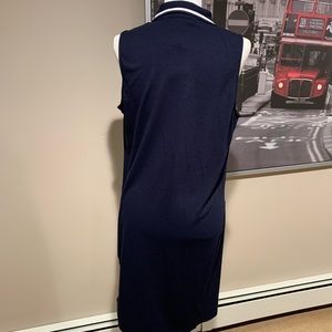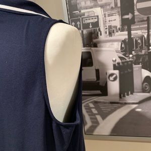 Sleeveless navy blue dress with a white stripe around the collar