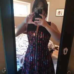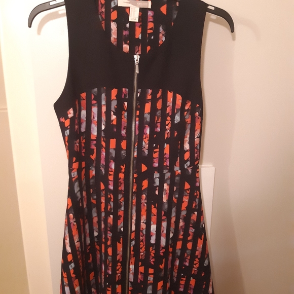 Flattering multi floral dress that zips all the way down. No issues with dress, only worn a few times, is too tight on me.