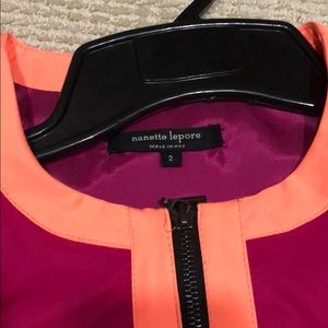 Magenta dress with orange trim. Front zipper goes all the up and down. Pockets. Size 2.
