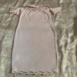 This is a nude colored dress. It is shoulder less but has a cute short sleeve.
