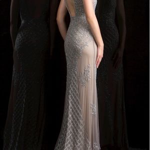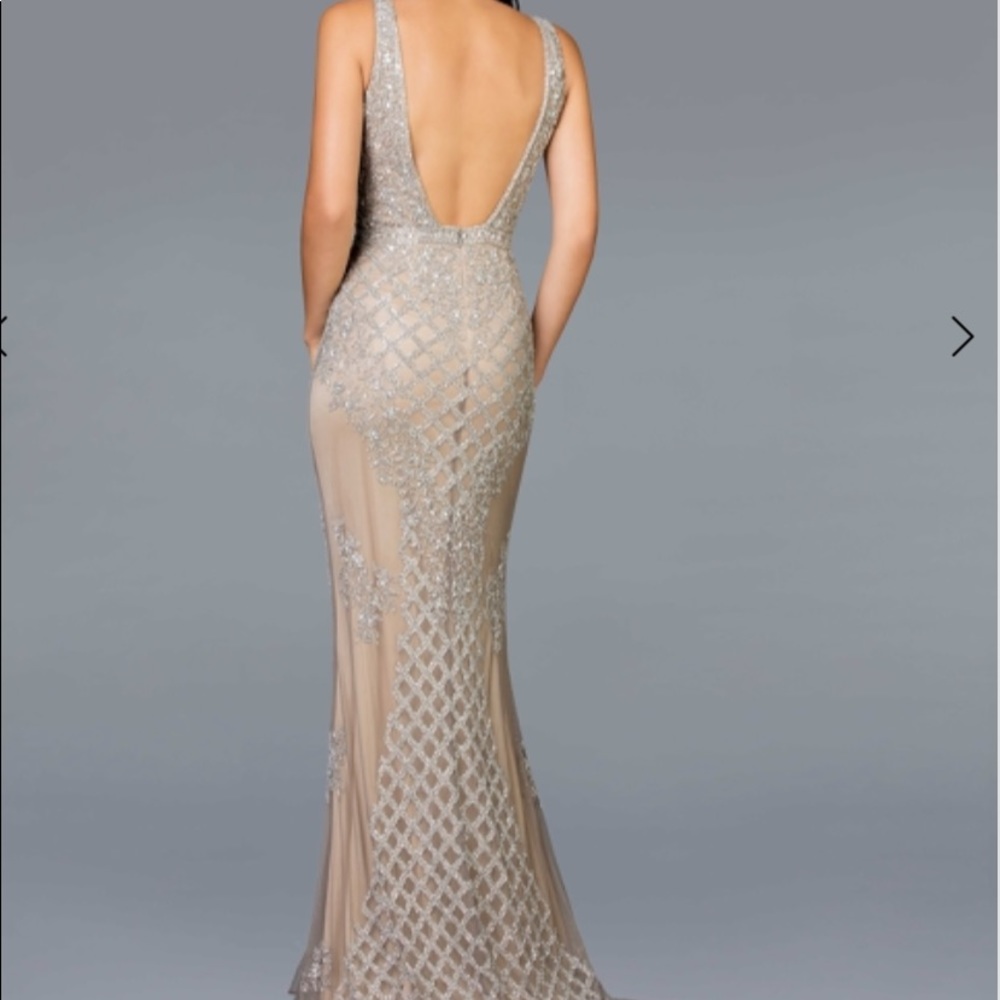 Nude/silver long dressy dress/ beautiful dress bought for my sons wedding, they changed the month due to covid19, it’s just won’t go with the new venue! It’s a size 8. There is a hook in the back to pull up the train.