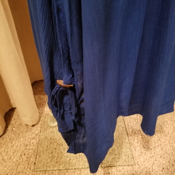 This great lightweight gauze rayon dress is available in royal or black it has a gathering on each side at hem line . Selling fast just a few left