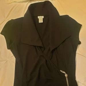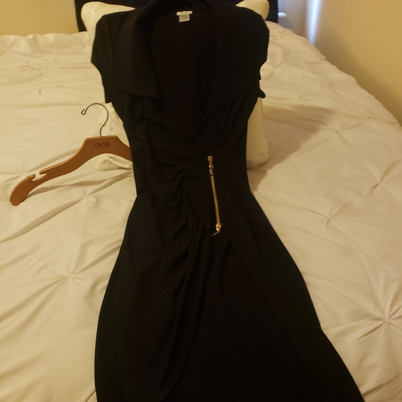 Beautifully fitted blackdress with gold zipper front, short sleeved, A-ligned, worn only twice, smoke free home. I'm 5'6" and it falls a bit below the knee.