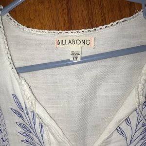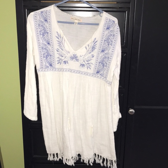 White long sleeve Bohemian style dress with blue embroidery and fringe on bottom